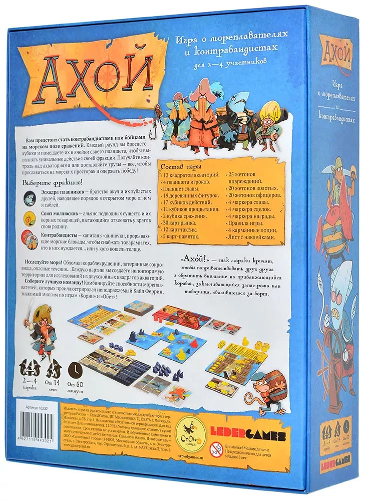 «Ахой» — это асимметричная стратегическая игра для 2-4 игроков, где каждый раунд создаёт уникальную карту мира из жетонов акваторий. В зависимости от выбранной фракции вам предстоит либо захватывать территории, либо искусно провозить контрабанду, используя результаты бросков кубиков для исследований, перемещений и тактических манёвров. Экономика, маршруты и действия соперников переплетаются в хитрую сеть, где каждое решение имеет последствия. Победа достанется тому, кто наберёт больше славы — через господство на воде, доставку грузов или искусное маневрирование между интересами других капитанов. Готовьте корабли: в этом плавании важны не только сила ветра, но и гибкость ума! А яркие, самобытные иллюстрации и красочность игры лишь помогут вам проникнуться атмосферой этого мира и сделают процесс незабываемым.