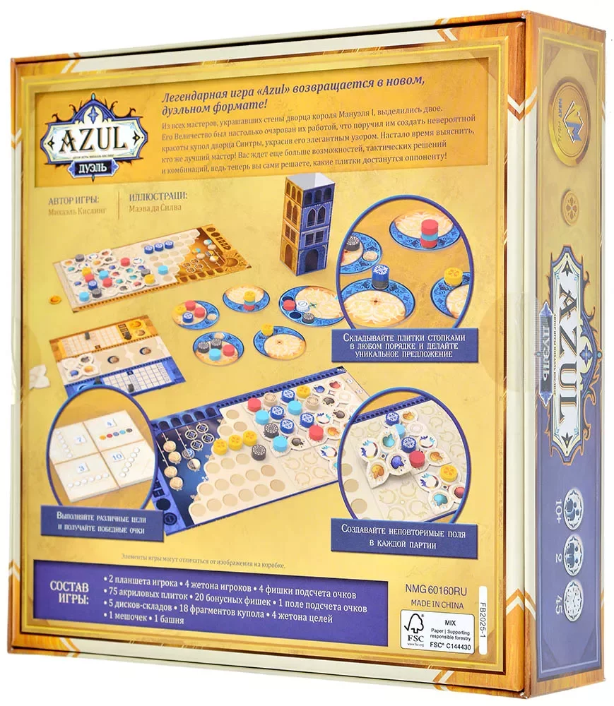 «Азул: Дуэль» — это абстрактная настольная игра, в которой вы выступите в роли мастеров, украшающих купол дворца Синтры по указу короля Мануэля I, желающего сделать Португалию как никогда красивой. На сей раз вас будет всего двое: вы настолько выделились во время работы над прошлыми проектами, что правитель не рискнул доверить столь ювелирную задачу кому-то другому. Как и всегда в «Азуле», вам предстоит поочерёдно выбирать цветные плитки и размещать их на своих планшетах, стремясь создать наиболее гармоничные и ценные узоры. Игра сочетает простые правила с глубоким стратегическим процессом, требуя от участников тщательного планирования и тактических решений. А благодаря эстетичному оформлению вам будет не только интересно играть, но и визуально приятно!