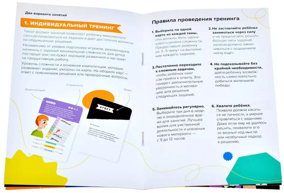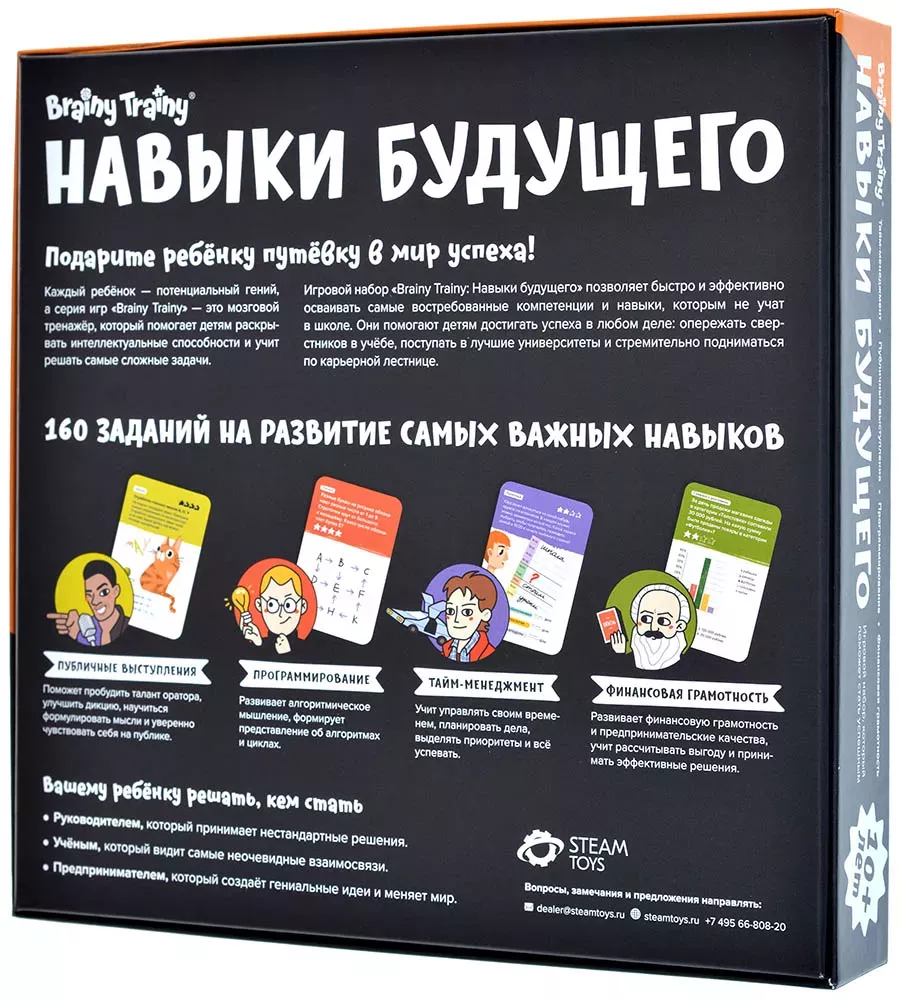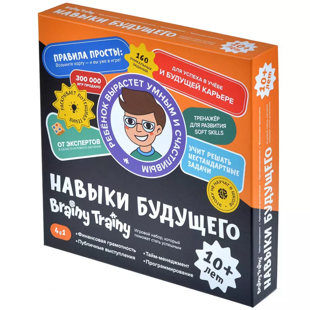 «Brainy Trainy: Навыки будущего» — включает в себя 160 карточек с заданиями сразу из нескольких игр серии: «Публичные выступления», «Программирование», «Тайм-менеджмент» и «Финансовая грамотность». Каждый ребёнок по-своему гениален, важно лишь правильно раскрыть его потенциал. Чтобы обучение не превратилось в мучение и не доставляло скуку, и были разработаны игровые развивающие наборы. Игровой процесс не только стимулирует интерес и вовлечённость ребёнка, но и способствует лучшему восприятию и усвоению новой информации.