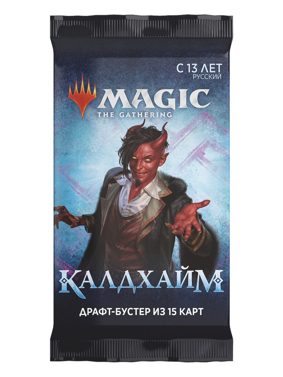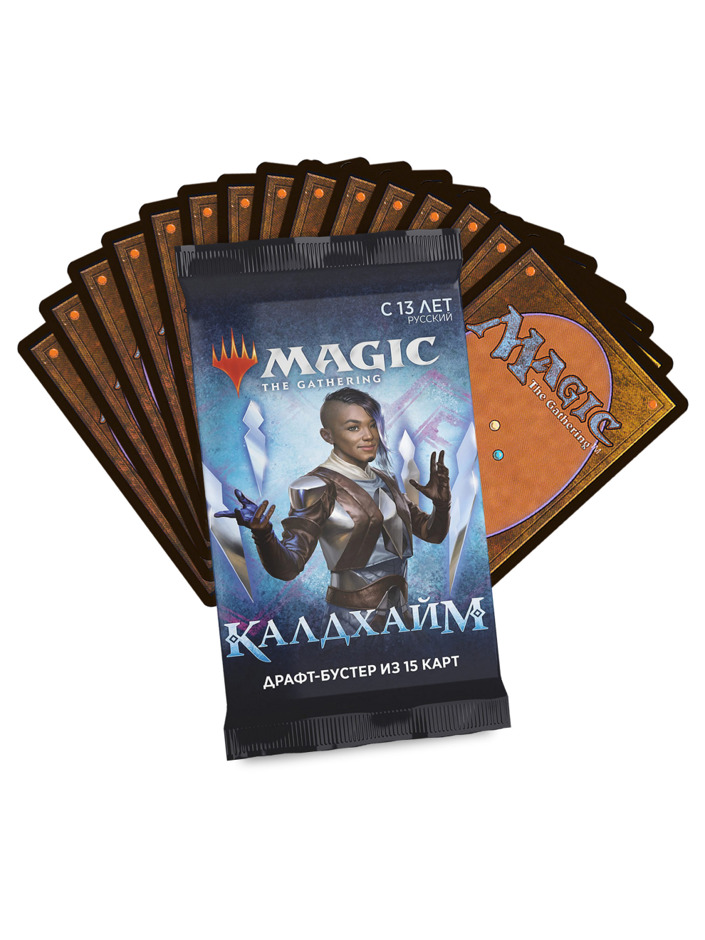Драфт-бустер издания Калдхайм содержит 15 случайных карт. В каждом бустере Вы найдете 1 базовую землю, 10 обычных карт, 3 необычных, 1 редкую или мифическую карту, а также - возможно - одна из них будет фойловой. Также есть вероятность найти в бустере карту-токен.