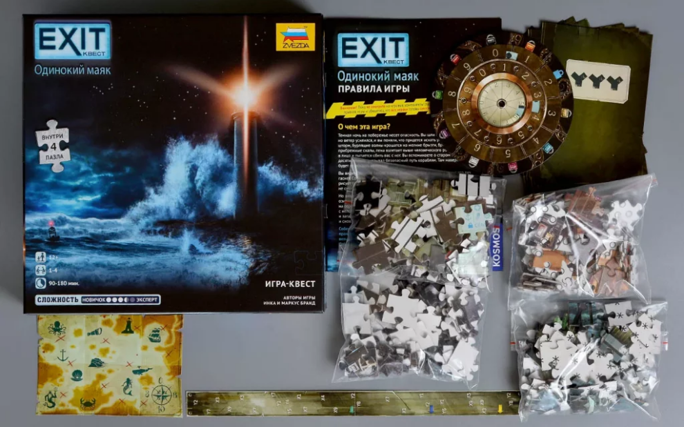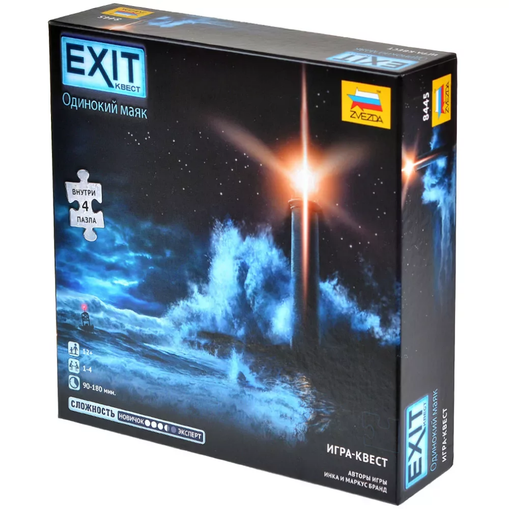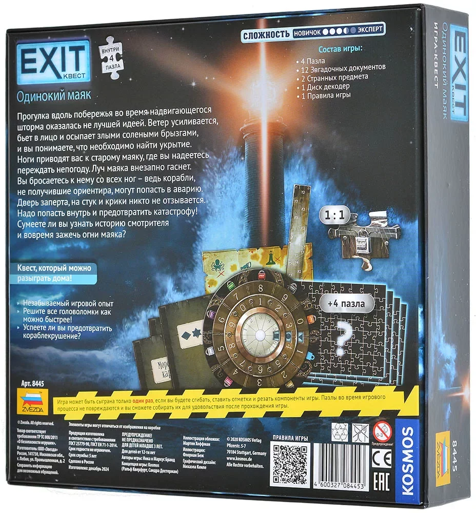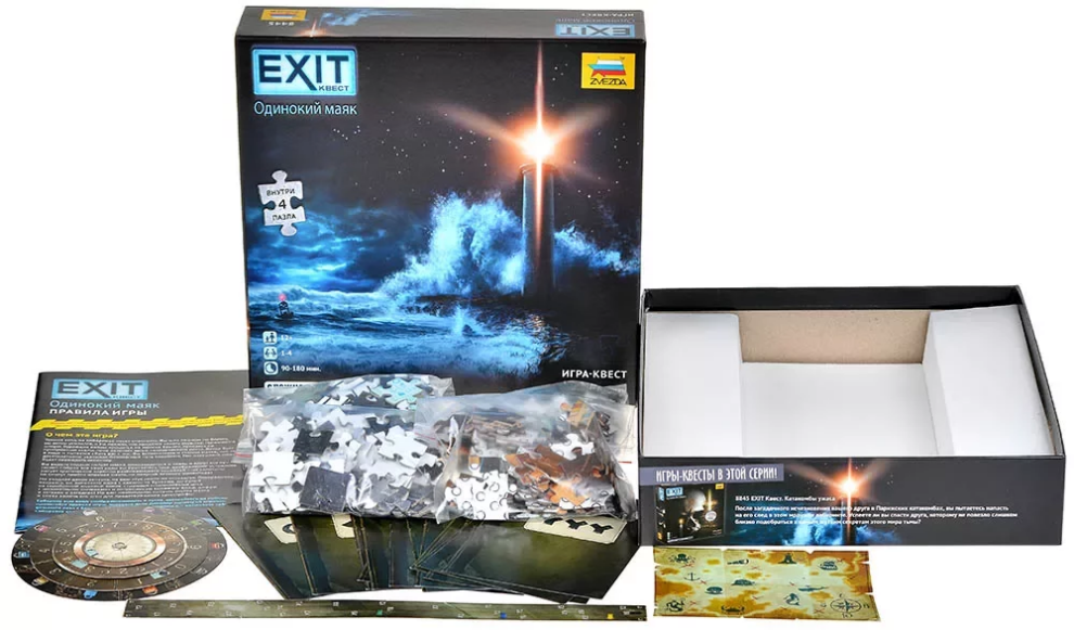 «EXIT-Квест: Одинокий маяк» — это настольная игра в жанре квеста, где вам предстоит разгадывать головоломки, собирать пазлы, копаться в загадочных документах и применять логику, чтобы разобраться с кодами и шифрами таинственного маяка. Это увлекательное приключение, полное интриг и неожиданных находок. Серия «EXIT-Квестов» позволяет ощутить дух настоящих эскейп-румов, не выходя из дома. Соберите команду, включите смекалку и попробуйте решить все загадки, прежде чем буря поглотит побережье!