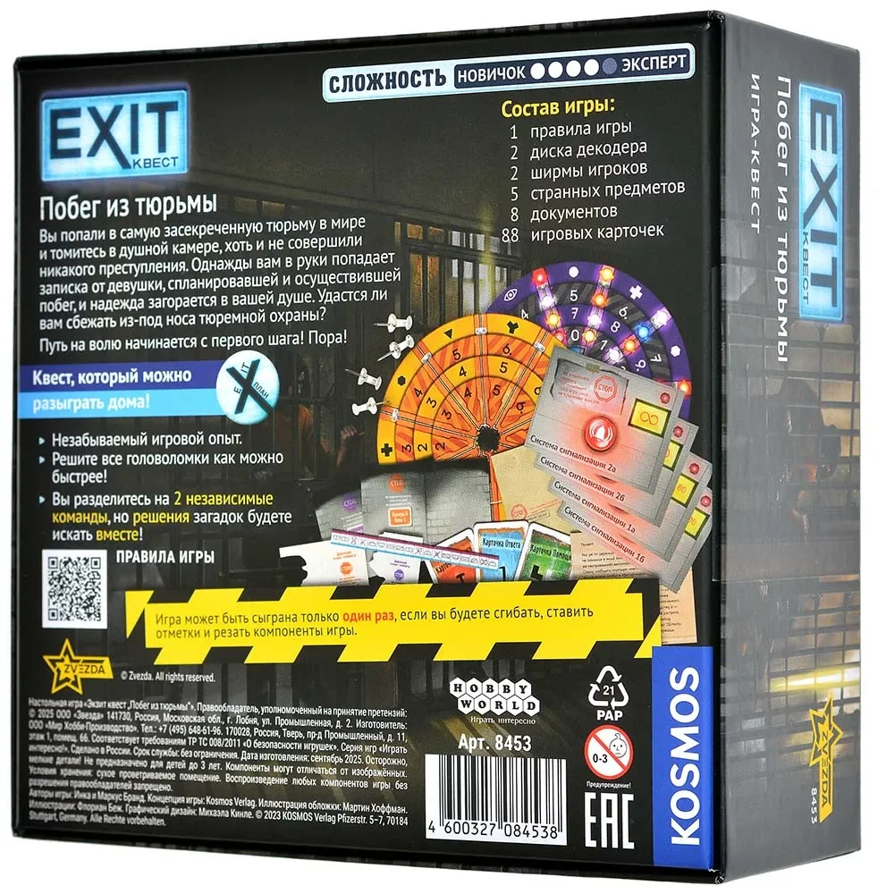 «EXIT-Квест: Побег из тюрьмы» — это настольная квест-игра, которая привнесёт атмосферу напряжённого триллера за ваш стол. Всё в лучших традициях серии, но с уникальным нововведением: впервые вы разделитесь на две независимые команды, которые при этом будут работать на одно благое дело!