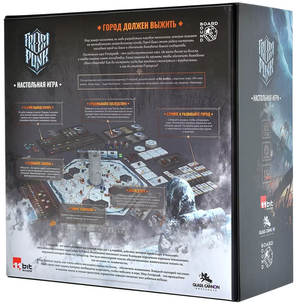 Frostpunk: The Board Game — это кооперативная игра, в которой на ваши плечи ляжет роль лидера маленькой колонии уцелевших в ледяном апокалипсисе. Основной игровой процесс не так сложен в своей сути, сколько в том, какие жестокие вызовы он будет бросать вам на протяжении всей партии. Ваша основная обязанность — как можно эффективнее управлять инфраструктурой развивающегося города и его гражданами. Но жители не будут просто бездушными фигурками на поле: каждый член общества будет предъявлять свои требования и различным образом реагировать на принимаемые вами решения! Любое ваше действие повлечёт за собой последствия, но какое — будет зависеть лишь от вас. И в этих обстоятельствах только вам решать, как распорядиться судьбами своего народа: относиться ли к ним как к еще одному расходуемому ресурсу, или стать для них примером для подражания, бесстрашным исследователем и борцом за новую жизнь в будущем?