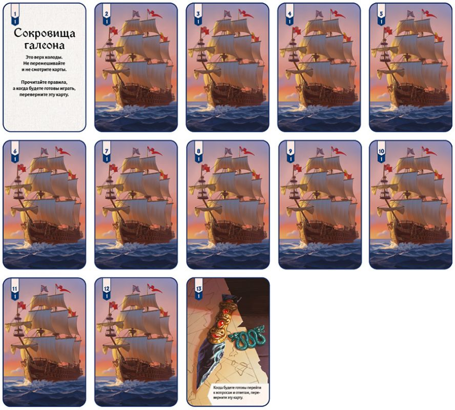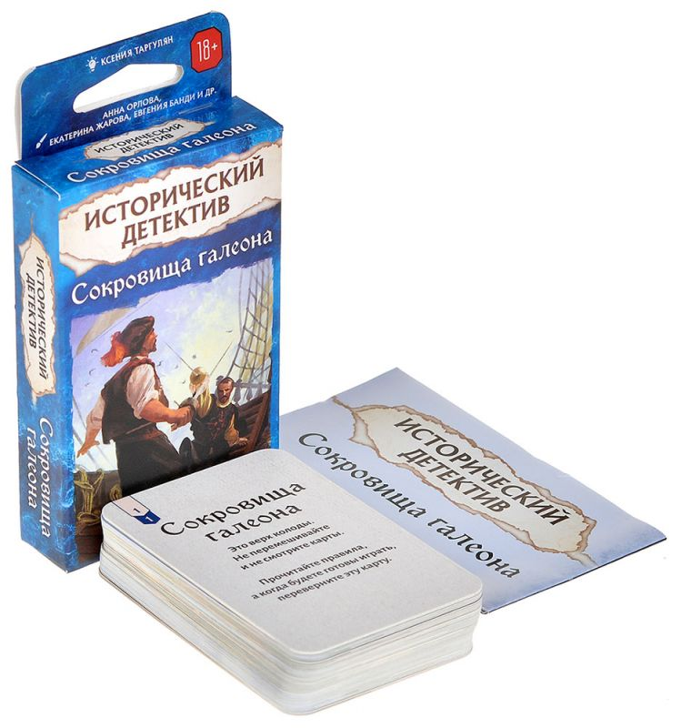 «Сокровища галеона» — настольный детектив с атмосферой исторического приключения, где вы расследуете кражу на борту испанского галеона. Игра рассчитана на компанию от одного до четырёх игроков. В вашем распоряжении тринадцать колод карт, каждая из которых раскрывает новые улики, диалоги с персонажами и детали обстановки. Уникальность игры — в её визуальной составляющей: иллюстрации полны скрытых подсказок, а эмоции персонажей помогают понять, кто лжёт. Механика действий добавляет напряжённости — каждое решение должно быть взвешенным. Вы будете разгадывать тайну, переворачивая карты, но будьте внимательны: некоторые из них требуют затраты действий, а другие открываются бесплатно. В конце игры вас ждёт финальный тест — сканирование QR-кода с вопросами, где вы проверите свою интуицию и логику.