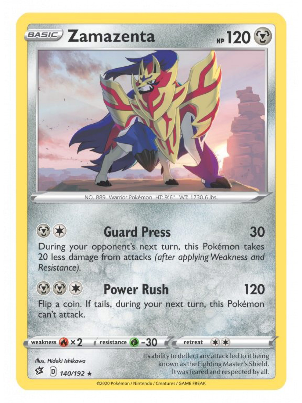 Прочный, как щит, легендарный покемон Земазента и группа воинов-покемонов готовы к бою! Дюралюдон быстро заряжает вас, а исследования Профессора гарантируют, что в вашей руке всегда будет много вариантов для розыгрыша. А Корвинайт и Ферроторн добавляют стальной решимости достичь свою цель!