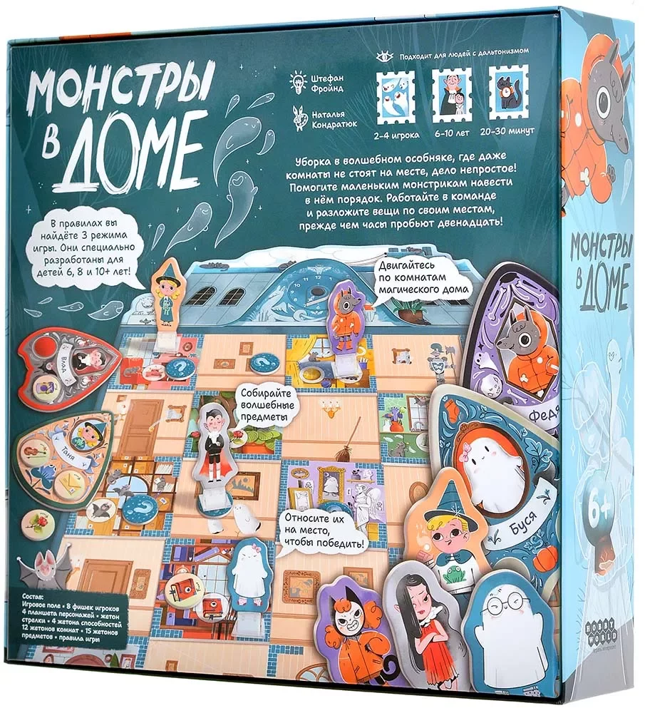 «Монстры в доме» разработаны специально для детей: вы найдёте три отдельных режима игры, адаптированных под разный возраст, что позволит всей семье постепенно осваивать правила и получать наслаждение от процесса. Игра не только подарит массу положительных эмоций, но и научит детей действовать сообща, развивая стратегическое мышление и внимательность. А красочное оформление сделает каждую партию незабываемым приключением!