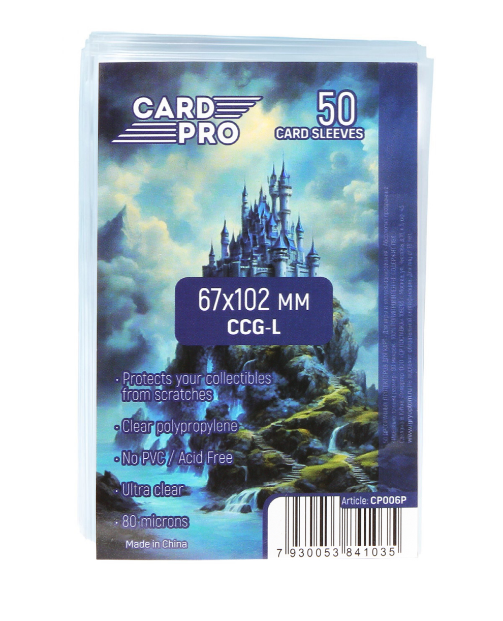 Упаковка из 50 прозрачных протекторов Card-Pro для карт. Абсолютно прозрачные протекторы размером 67×102 мм вмещают в себя карточки шириной до 66 мм и высотой до 101 мм включительно. Толщина стенки протектора — 80 микрон (микрометров). Верхняя загрузка. Изготовлены из 100% полипропилена без использования ПВХ.
