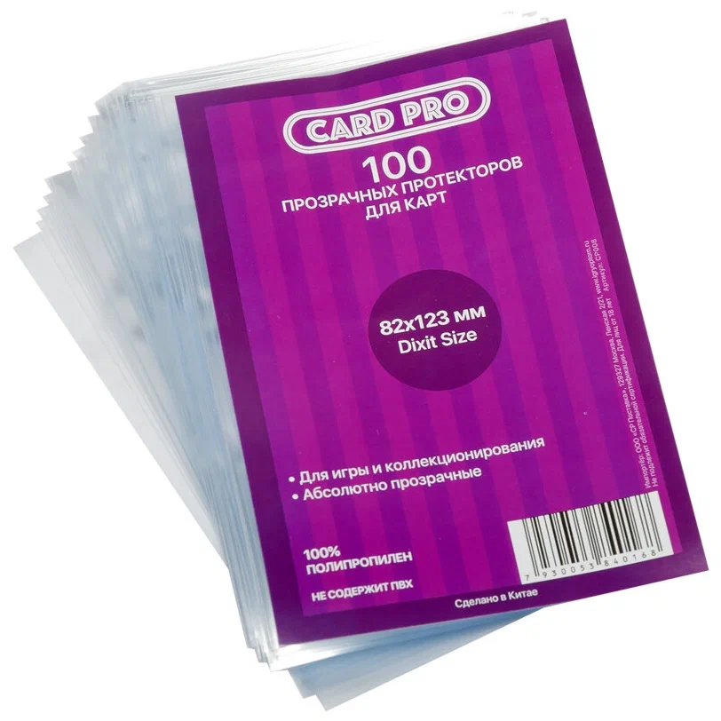 Упаковка из 100 прозрачных протекторов Card-Pro для карт. Абсолютно прозрачные протекторы размером 82×123 мм вмещают в себя карточки шириной до 81 мм и высотой до 122 мм включительно. Толщина стенки протектора — 40 микрон (микрометров). Верхняя загрузка. Изготовлены из 100% полипропилена без использования ПВХ.