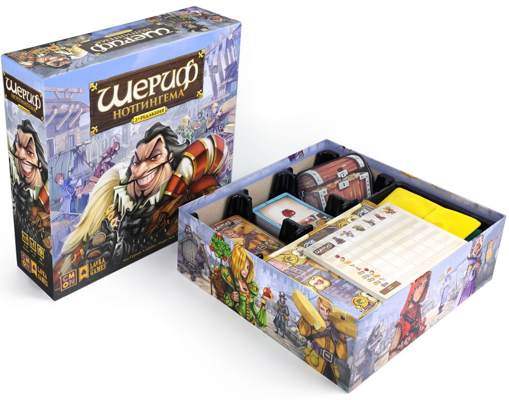Вторая редакция игры Шериф Ноттингема включает обновлённые правила, современное и красочное художественное оформление, а также лучшие модули дополнения Благородные разбойники — Королевские товары, Чёрный рынок и расширение для 6 игроков.