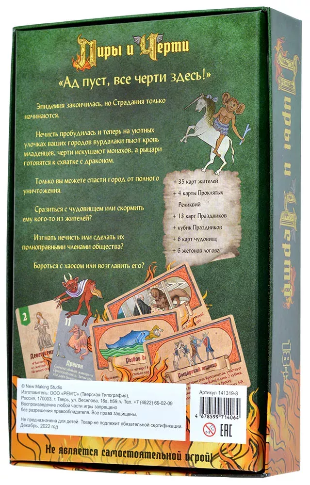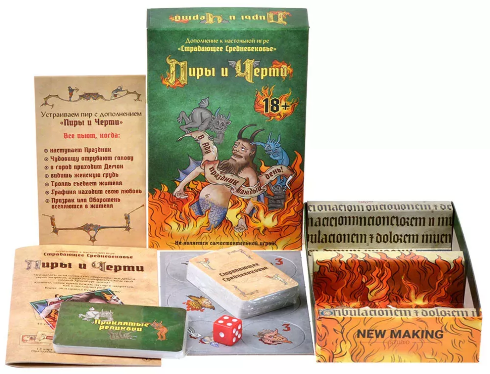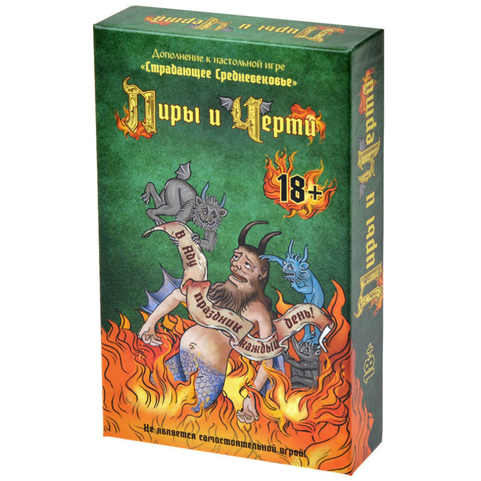 «Пиры и черти» — это второе дополнение для игры «Страдающее Средневековье». Оно совместимо в том числе и с дополнением «Омерзительное Средневековье». Итак, что вы найдёте внутри: