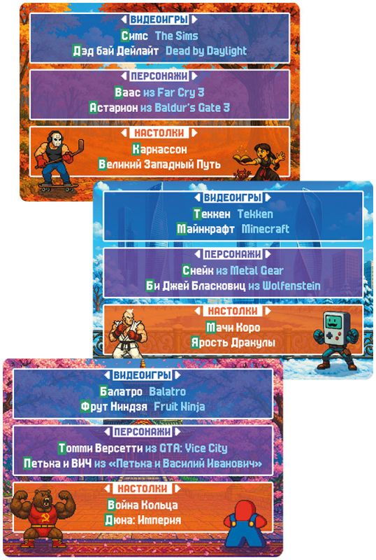 «В двух словах: Игры» — это увлекательная настольная игра, где вам предстоит объяснять названия и имена всего двумя словами, начинающимися на определённые буквы. В основе три уровня сложности, а каждый раунд — это новое испытание для вашей смекалки и эрудиции. Выбирайте карту, смотрите на цветные буквы невыбранных квестов и придумывайте ассоциации, которые приведут к победе. Уникальные правила запрещают однокоренные слова и жесты, делая игру ещё интереснее. А если хотите упростить задачу — воспользуйтесь «чит-кодом» из дополнительных правил!