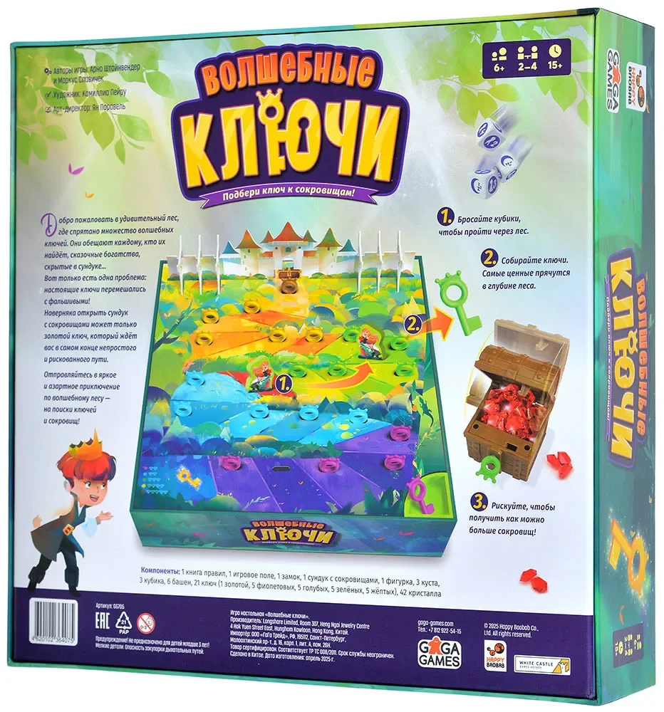 Правила игры просты и увлекательны: игроки по очереди бросают специальные кубики, выбирают один из них для перемещения по объёмному игровому полю и пытаются достать волшебные ключи. Каждый ключ — это попытка открыть сундук с сокровищами. Настоящий ключ принесёт вам драгоценные камни, а фальшивый можно обменять на дополнительные ходы. Особую ценность представляет золотой ключ — он гарантированно откроет сундук и принесёт целых 5 кристаллов!